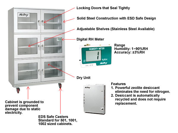 According to IPC/JEDEC J-STD 033D, IC packages should be stored in a dry box capable of maintaining either 10%RH or 5%RH in order to prevent components from absorbing moistureMcDry(TM) Electronic Drying Storage Cases provide low humidity storage without the use of nitrogen. Humidity is removed from the cabinets by use of a powerful zeolite desiccant. The desiccant is automatically recycled with a heating mechanism thus optimizing its absorption capability and does not require replacement. Moisture absorbed by the powerful zeolite desiccant is vaporized and released outside of the cabinet. Memory shaped metal is utilized for fail proof ventilation. Natural air-flow convection system desiccates the entire cabinet without requiring the use of a fan.